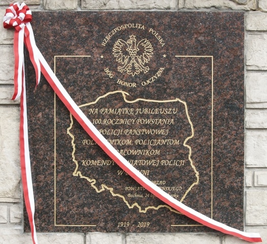 W 100. rocznicę powstania Policji Państwowej w Komendzie Powiatowej Policji w Bochni odsłonięto tablicę upamiętniającą to doniosłe wydarzenie24 lipca 2019 roku.