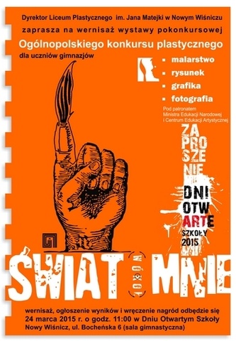 O godzinie 11.00 na sali gimnastycznej odbędzie się ogłoszenie wyników, wręczenie nagród laureatom Ogólnopolskiego Konkursu Plastycznego dla uczniów gimnazjów Świat wokół mnie oraz wernisaż wystwy pokonkursowej.