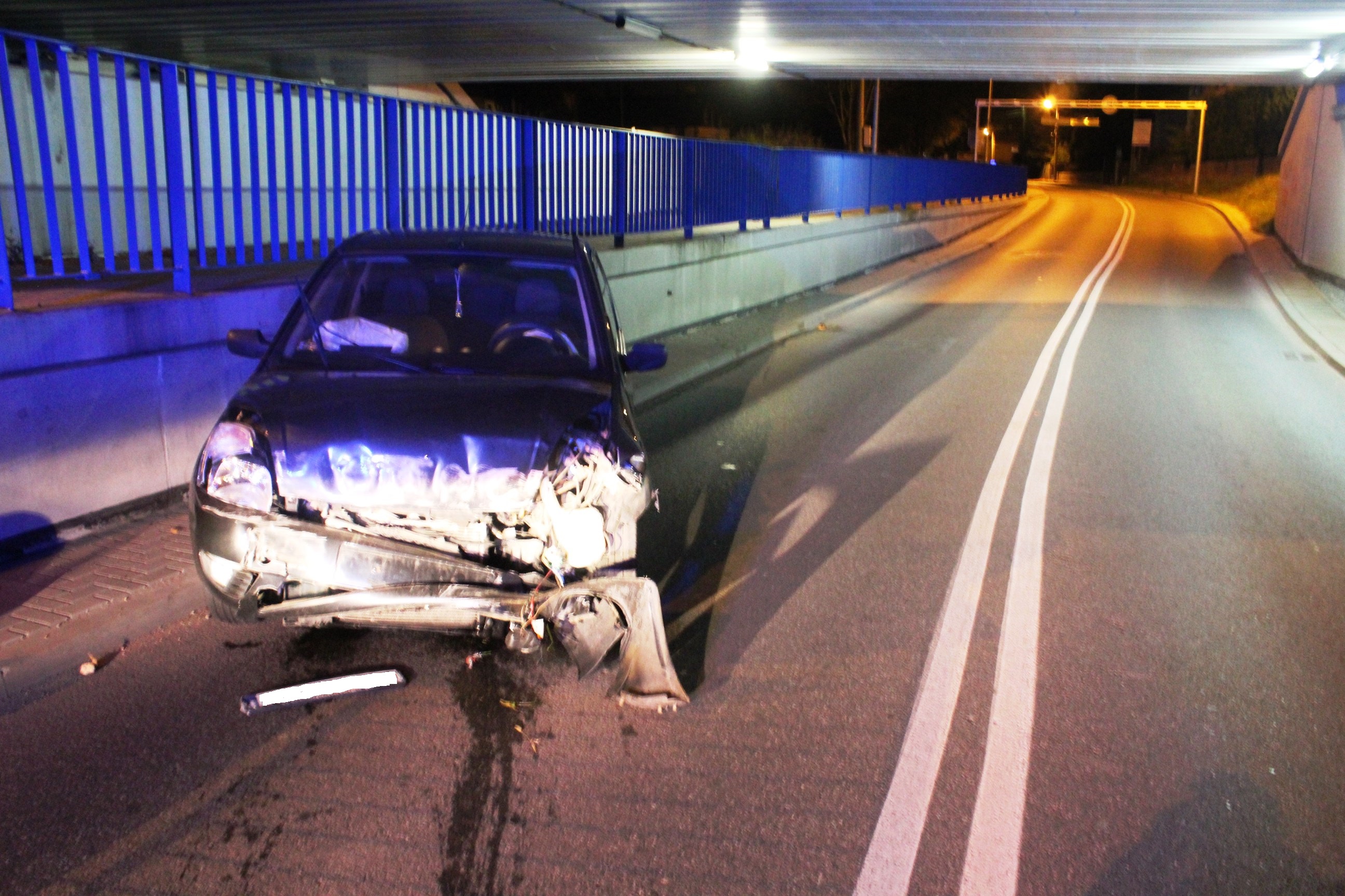 Policjanci prowadząc działania ukierunkowane na eliminowanie z ruchu drogowego nietrzeźwych kierujących, dzisiaj w nocy (28.10.), około godziny 0:30 na ul. Trudnej w Bochni próbowali zatrzymać do kontroli drogowej osobowego forda, którego kierujący na widok policjantów najpierw zwolnił, a następnie gwałtownie przyspieszył. Pomimo wydawanych przez policjantów widocznych znaków do zatrzymania, kierujący nie zatrzymał się i zaczął uciekać, skręcając z ulicy Trudnej w kierunku ulicy Poniatowskiego. Policjanci ruszyli w pościg, który jednak nie trwał długo, gdyż kierujący fordem w momencie skręcania w ulicę Wygoda stracił panowanie nad pojazdem i uderzył w betonowy mur wiaduktu kolejowego. Za kierownicą forda siedział młody mężczyzna, który początkowo nie chciał podać swoich danych i zachowywał się agresywnie. Gdy policjantom udało się uzyskać informację co do tożsamości kierującego okazało się, że jest to 23 - letni mieszkaniec Bochni. Mężczyzna poddany badaniu na zawartość alkoholu w organizmie „wydmuchał” 1,22 promila alkoholu. Wskutek zderzenia zarówno 23-latek jak i młodsza o rok pasażerka nie odnieśli obrażeń.