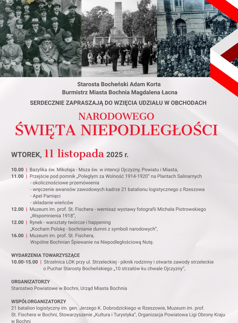 Starosta Bocheński Adam Korta i Burmistrz Miasta Bochnia Magdalena Łacna serdecznie zapraszają do wzięcia udziału w obchodach Narodowego Święta Niepodległości na terenie Bochni.