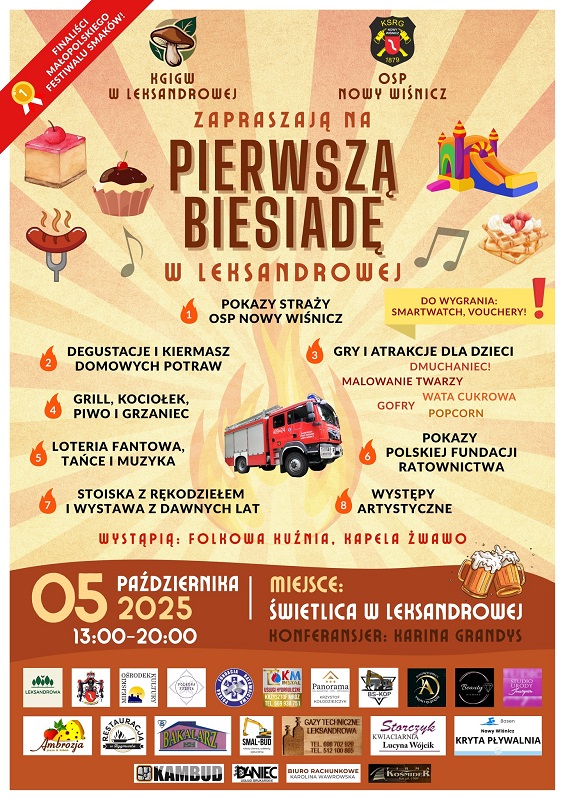 Na uczestników czeka moc atrakcji: pokazy strażackie i ratownicze, grill, kociołek, kiermasz domowych specjałów, a także piwo i grzaniec,bezpłatne atrakcje dla najmłodszych – dmuchaniec, malowanie twarzy, gofry, popcorn i wata cukrowa, loteria fantowa z nagrodami, koncerty i występy artystyczne, w tym Folkowa Kuźnia i Kapela Żwawo, które porwą publiczność do wspólnej zabawy.