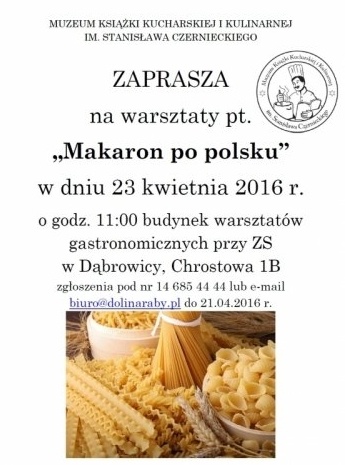 Muzeum Książki Kucharskiej w Chrostowej organizuje w sobotę 23 kwietnia o godz.11:00 bezpłatne warsztaty kulinarne. Warsztaty będą odbywały się pod hasłem "Makaron po polsku".