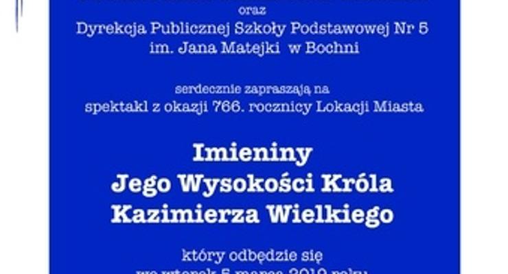 Burmistrz Miasta Bochnia oraz Dyrekcja Publicznej Szkoły Podstawowej Nr 5 im. Jana Matejki w Bochni serdecznie zapraszają na spektakl z okazji 766. rocznicy Lokacji Miasta pt. "Imieniny Jego Wysokości Króla Kazimierza Wielkiego".