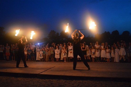 Ze sceny rozbrzmiewała wspaniała ludowa muzyka, a wszyscy zebrani mogli podziwiać przygotowane układy taneczne nawiązujące do świętojańskiej nocy zarówno strojami, scenografią jak i rekwizytami. Najważniejszym obrzędem było puszczanie wianków z nurtem rzeki z zapalonymi świecami. To niezwykle klimatyczne i miłe spotkanie zakończył kuglarski pokaz z ogniem w wykonaniu Teatru "Feniks". Niespodzianką dla publiczności były odpalone przez gości z drugiej strony Raby sztuczne ognie, jak i rozświetlające powrotną drogę prawdziwe robaczki świętojańskie, które stały się doskonałym uzupełnieniem tej niezwykle oryginalnej imprezy.