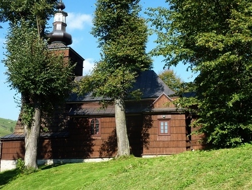 Zabudowa wsi koncentruje się u ujścia potoku do Popradu, miejsca tu niewiele, lecz sama cerkiew swoim zwyczajem stanęła powyżej domostw, na wzgórzu, otoczyły ją lipowe drzewa i kamienny murek nakryty gontowym daszkiem. Patrzę na miłą oku budowlę z 1864 r. wystawioną przez miejscowych grekokatolików, wzniesiono ją na wzór i podobieństwo do innych cerkwi zachodniołemkowskich. A więc jest to budowla trójdzielna, o wyraźnie wykształconych poprzez pełnione funkcje częściach konstrukcji. Mimo to cała bryła świątynnej budowli stanowi niezaprzeczalnie stylową jednorodność, podkreśloną fakturą gontów pokrywających ściany i kompletem trzech baniastych hełmów wyrastających ponad blaszane dachy. Wieża, od której wszystko w cerkwi się zaczyna, u swej podstawy mieści babiniec, na szczycie zaś izbicę z trzema dzwonami, wyżej bania pokryta gontem, nad nią ślepa latarnia i promienisty krzyż znaczący to poświęcone miejsce. Warto zwrócić uwagę na malarskie zdobienia w obrębie latarni i poniżej dachu nawy, ich kolory ożywiają dostojeństwo ciemnych ścian cerkwi. Wnętrze cerkwi nie zmieniło się wiele od unickich czasów, ściany pokrywa polichromia, ikonostas choć niepełny, to na swoim miejscu i leciwy (XVIII – XIX w.), takoż ołtarz i feretrony z obrazami.