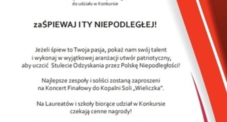 Dodawała odwagi, podtrzymywała nadzieję, dziś zaś wyraża radość i dumę z suwerennej Polski. Pieśń patriotyczna – bez niej świętowanie 100-lecia Niepodległości byłoby jak husaria bez skrzydeł! Wojewoda Małopolski oraz Kopalnia Soli „Wieliczka” zapraszają uczniów małopolskich szkół podstawowych oraz klas gimnazjalnych do udziału w niezwykłym niepodległościowym konkursie muzycznym.