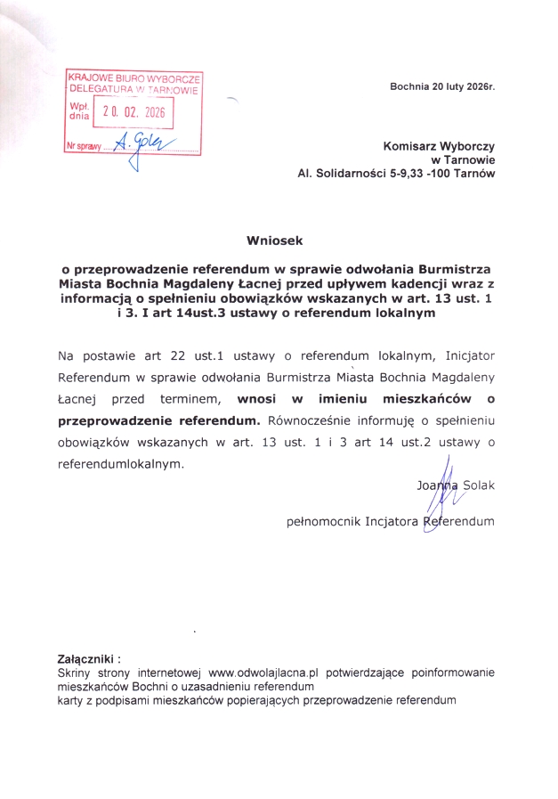 W dn. 20 lutego 2026 r. Pełnomocnik Inicjatora Referendum w sprawie odwołania Burmistrza Miasta Bochni Magdaleny Łacnej przed upływem kadencji na podstawie 22 ust. 1 ustawy z dnia 15 września 2000 r. o referendum lokalnym (Dz. U. z 2025 r. poz. 472) złożył wniosek wraz z kompletem wymaganych dokumentów i podpisami mieszkańców Bochni popierających, którzy poparli inicjatywę referendum do Delegatury Krajowego Biura Wyborczego w Tarnowie o wyznaczenie terminu i przeprowadzanie przedmiotowego referendum.