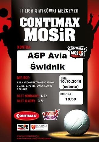 Spotkanie Contimax MOSiR Bochnia & ASPS Avia Świdnik odbędzie się w najbliższą sobotę 10 października 2015r. w Hali Widowiskowo-Sportowej im. W. Stawiarskiego przy ul. ks. J. Poniatowskiego 32 w Bochni. Początek meczu o godz. 16.30.